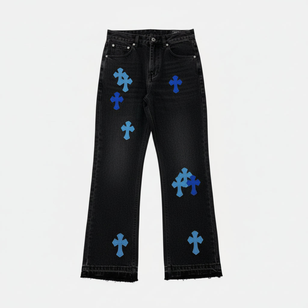 Los Chrome Hearts Levi’s Blue Cross Patch Jeans fusionan la artesanía clásica del denim americano con la estética gótica y lujosa de Chrome Hearts. Confeccionados en mezclilla negra premium, incorporan parches de cuero azul en forma de cruz cosidos a mano, aportando textura, contraste y carácter único. Cada pieza es una declaración de exclusividad y estilo irreverente, perfecta para elevar cualquier outfit street-lux.