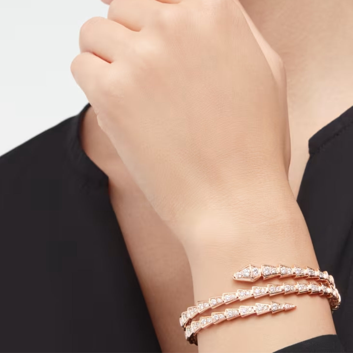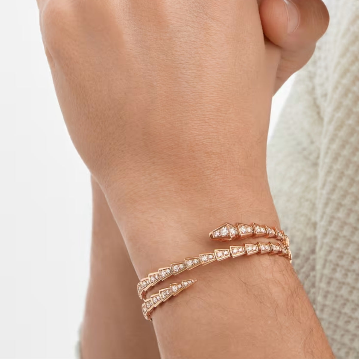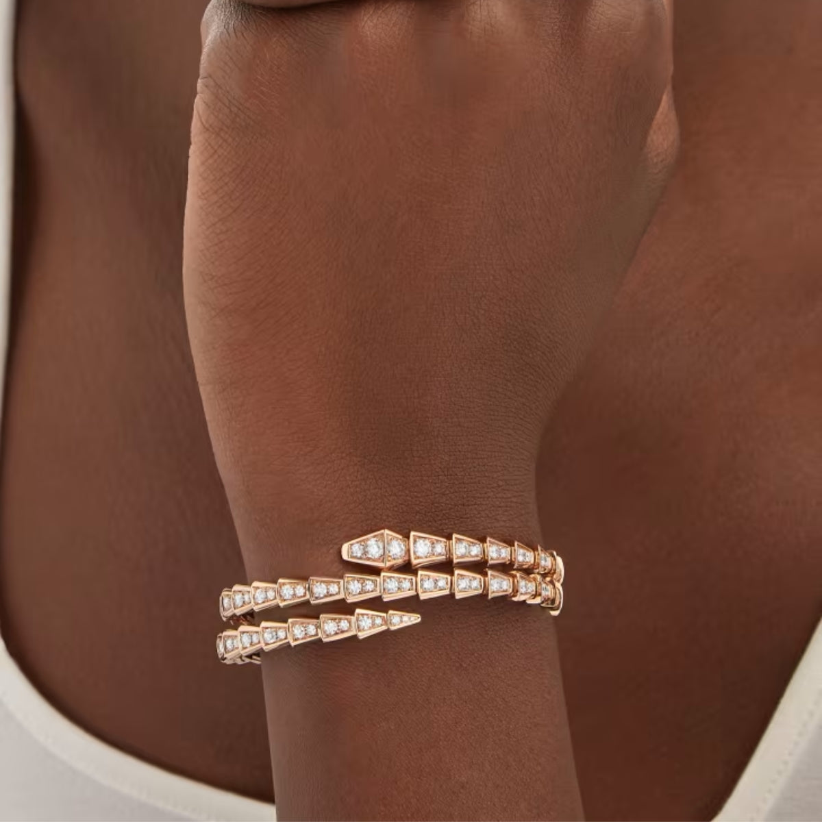 La Snake Bracelet V-Gold combina elegancia serpenteante con un brillo extremo gracias a sus gemas de zirconia de 2 mm, ofreciendo destellos intensos y sofisticados. Su diseño envolvente tipo “snake” se ajusta a la muñeca con fluidez, elevando cualquier look con lujo moderno.